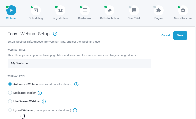 Automated - (our most popular choice) is the default setup & selection, its automated and has options to make it appear live. It also contains a self-destructive Built-in replay after the initial webinar is complete.