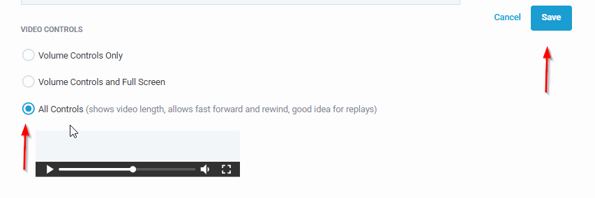 Scroll down until you find Video Controls. Choose All Controls. Hit Save. When you are done make sure to change this back to Volume Controls and Full Screen or Volume Controls Only, otherwise your attendees will see the same when you are live.