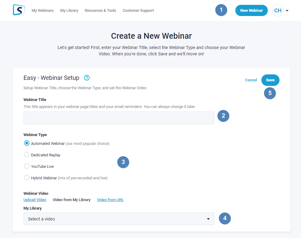 Click on the New Webinar button (1), and give your webinar a title (2), select the Webinar Type (Automated Webinar is the default choice) (3) select a webinar video (4), and then finally hit Save button (5).