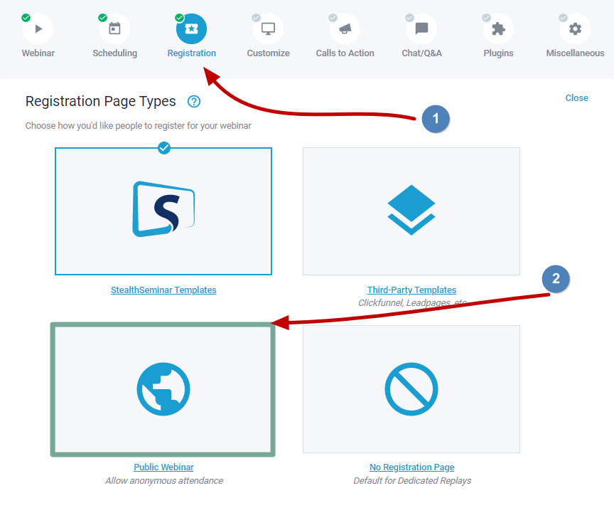 Once you set up the public webinar the above way, you will see this option in Registration > Registration Page Types