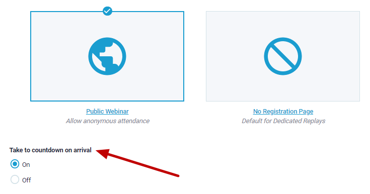 By default it will be turned on. When turned on, this automatically takes a visitor to next webinar available i.e the countdown page.