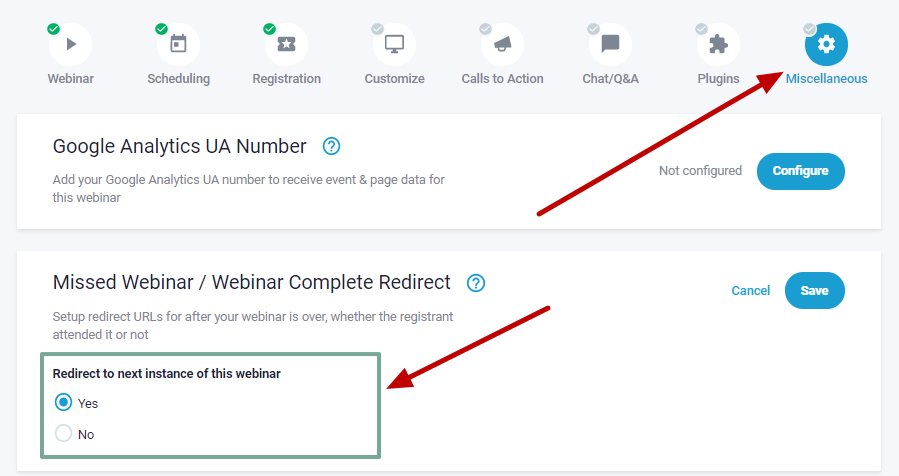 If you disable this option, you can set up the automatic redirect or keep the default Webinar Complete page.