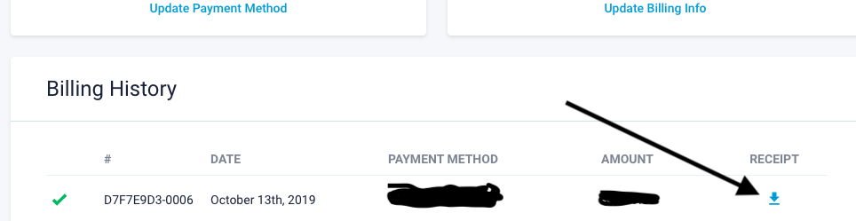 4. Scroll down the page to BILLING HISTORY. Here is a list of all your invoices that you have paid and you can download them with the little arrow to the right