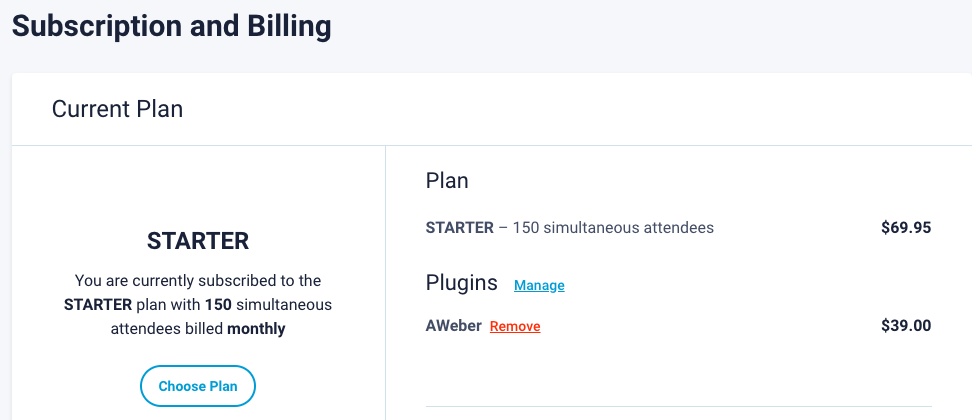 3. You are taken to the SUBSCRIPTION AND BILLING PAGE. On the right-hand side, you can manage your plugin subscription