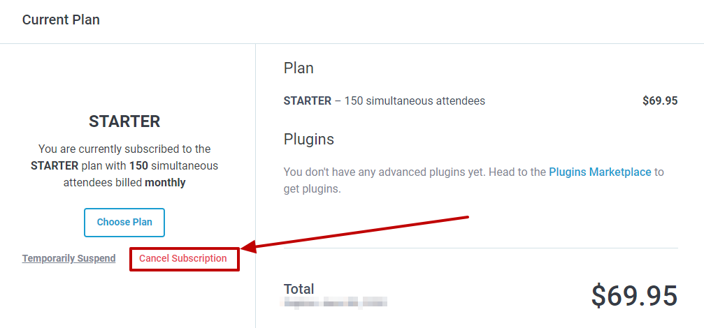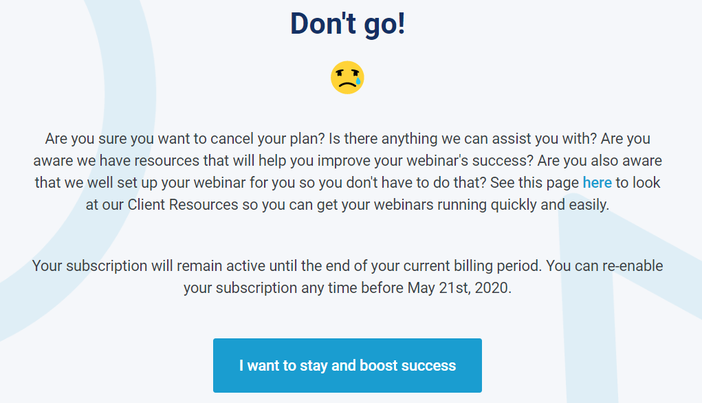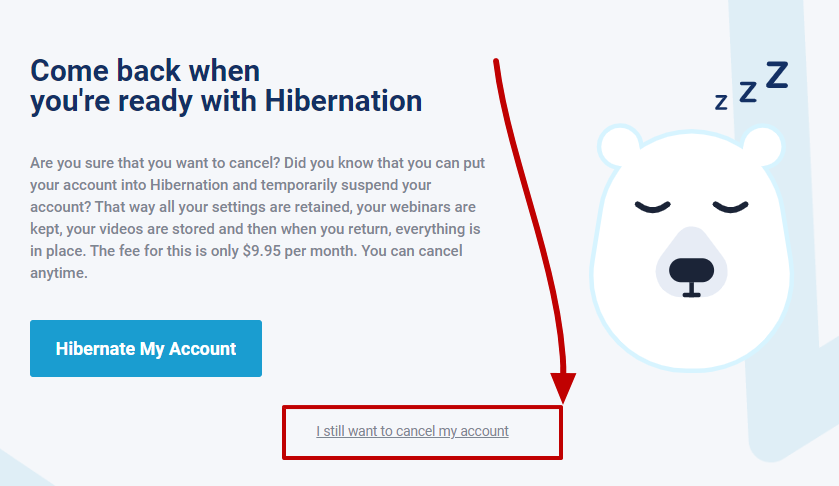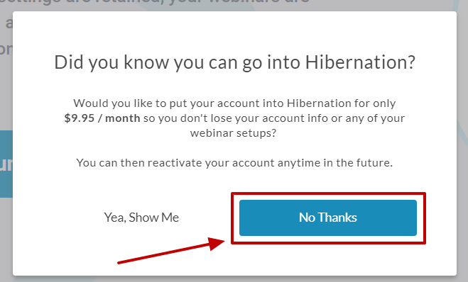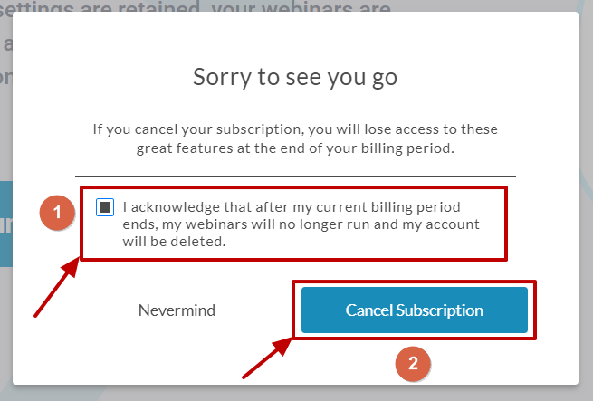 9. You will be prompted to confirm one last time, check I acknowledge that after my current billing period ends, my webinars will no longer run and my account will be deleted. and click on Cancel Subscription