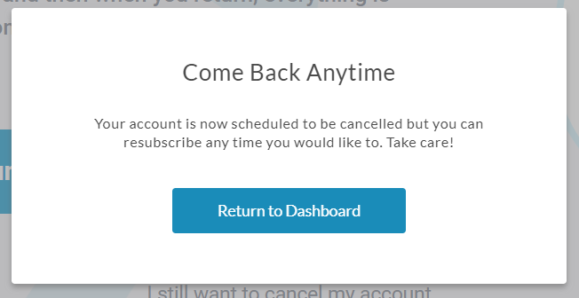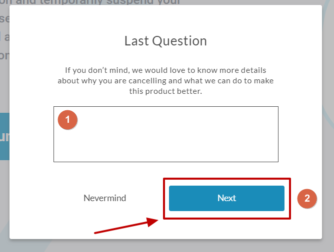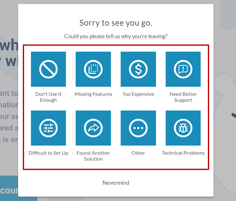 6. After clicking on I still want to cancel my account, you will see a window like the following. We appreciate you filling out our survey so we can continually improve our service. Please choose an option from this box