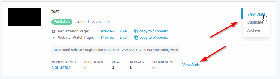You can find our statistics page for any individual webinar event at My Webinars (as shown below)