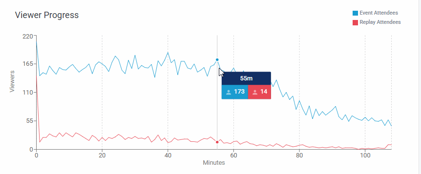 An aggregate display graph is provided in a summary of the event (as shown below), this represents attendees viewing the event, it does not include those who may be attending but have browser away from viewing. Viewer Progess can help to determine watchpage engagement well, or those points where the event may have been left running but browsed away from. If you sort stats. to any individual email address then check the graph, you can see when they browsed away from viewing directly. (though may still be attending your webinar event)