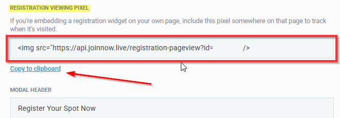 Use Copy to clipboard link there, and paste that individual webinar event pixel anywhere on your website page editors recommend that you place tracking pixel (it can be anywhere on same page as the widget)