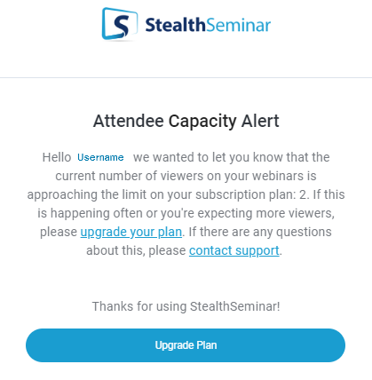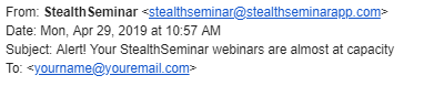 At 90% capacity, You will receive an email from us with subject line "Alert! Your StealthSeminar webinars are almost at capacity", which will look like this