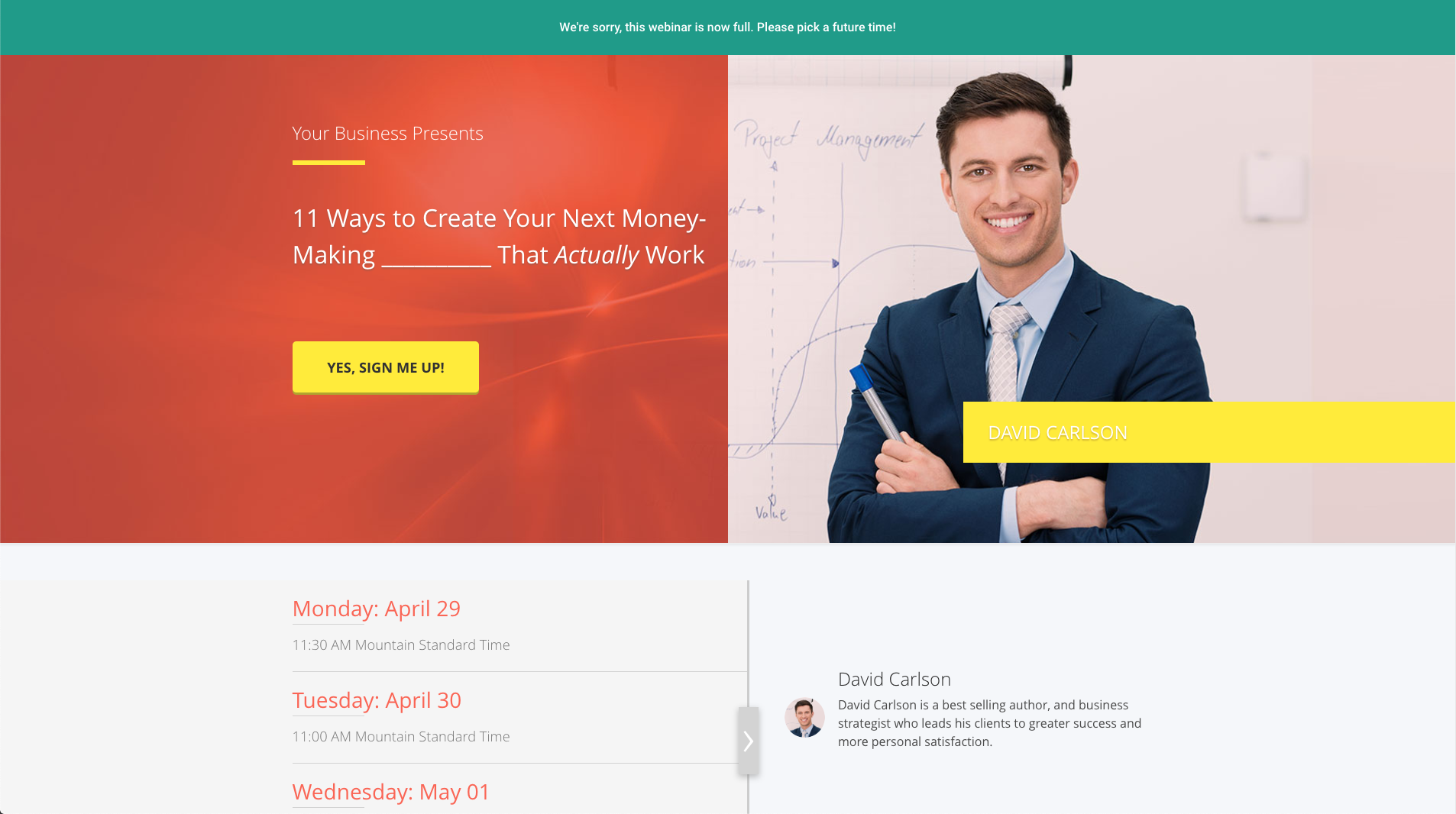 If an attendee attempt to watch a full webinar, they will be taken to the registration page and see a message at the top like this, which will read "We're Sorry, this webinar is now full. Please pick a future time!"
