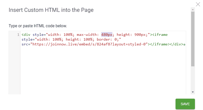 Then paste it here (back to your wordpress site's page builder that we left open) as you got it. Then in the code, just find "max-width: 480px" and replace "480px" with "620px". Then hit save.