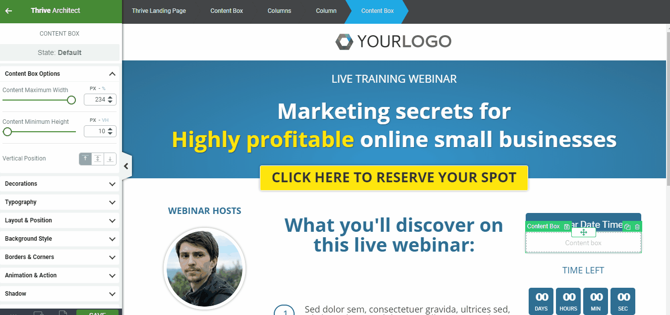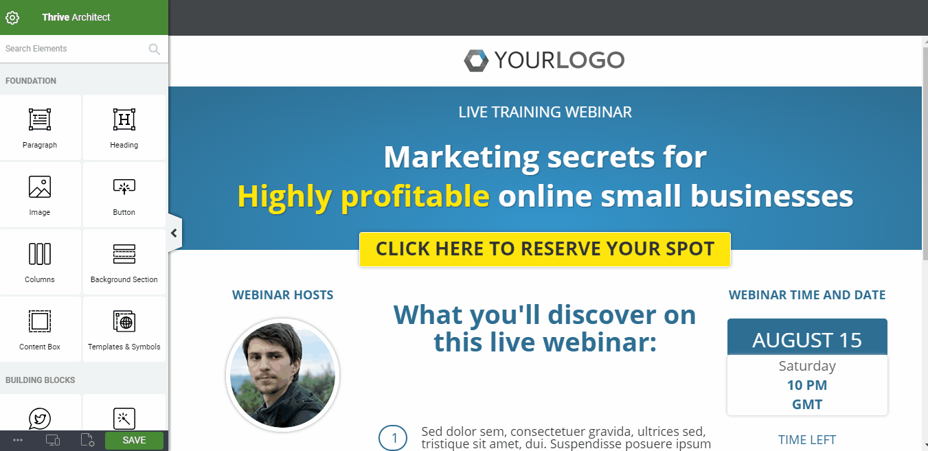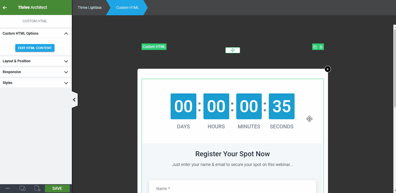 Once you are happy with the layout, hit "SAVE". Make sure you publish this, otherwise you will not find it to use it in the landing page builder later on.