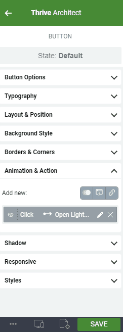 Go to your landing page editor with "Thrive Architect", and then click on the button on your page (if there is no button, please create one), and on the sidebar, click on "Animation & Action".