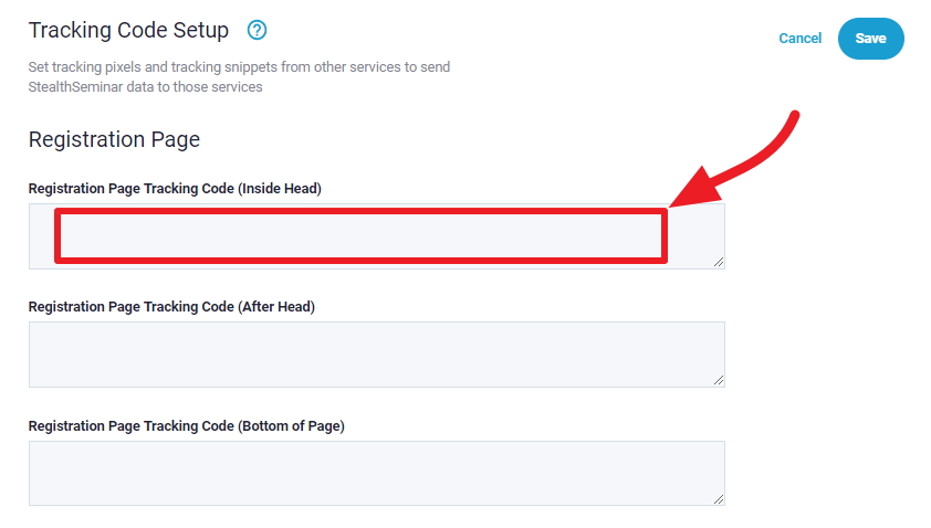 The first box is for placing the pixels inside <head></head>