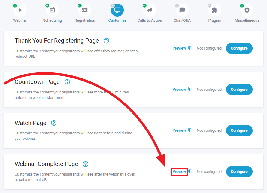 To see our "Webinar Complete Page" preview, go to your event editor, then click on "Customize".