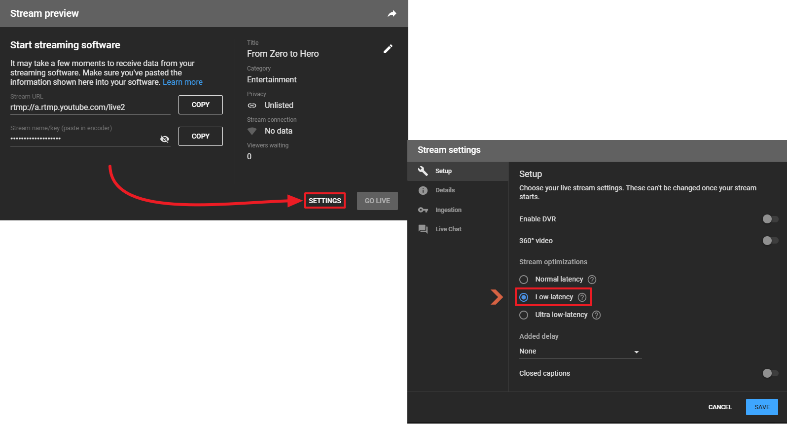 Please note: With live streaming, the benefit is there is no software for each of your attendees to install such as with GotoWebinar, Zoom, etc. The downside is there is a slight delay due to latency (about 6 seconds for our recommended setting below). Latency means the time it takes for the stream to reach each attendee's computer.