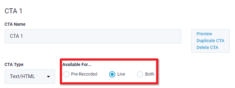 For hybrid events, you have to select for which type should the call to action appear, live or recorded or both. By default it is set to "Live"