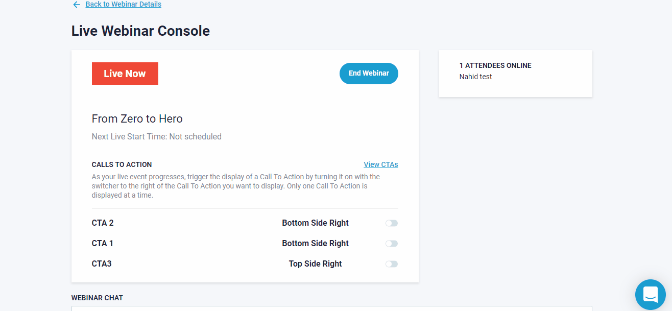 The calls to action that you add to your events, will automatically appear in your "Live Console" for hybrid/live webinars. And you can just turn them on and off this way: