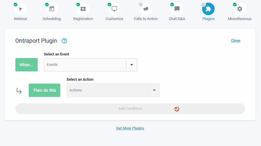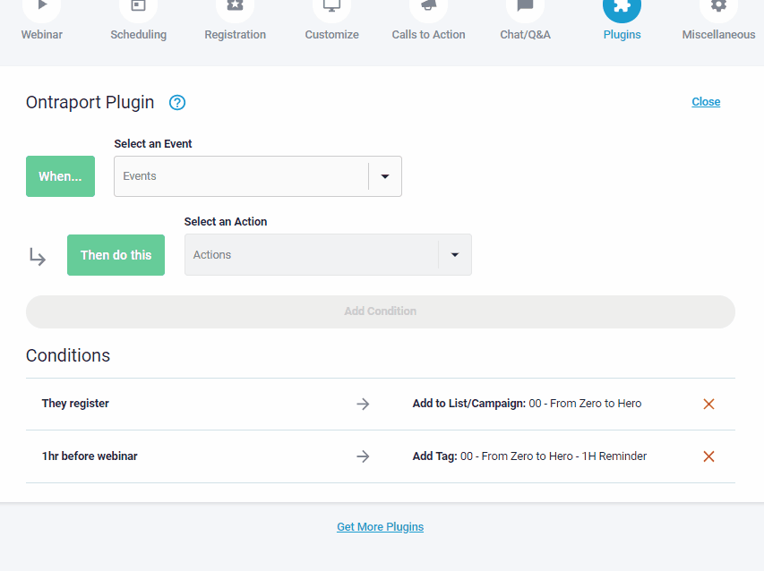 To find all the options, go to your event editor > "Plugins" > "Ontraport Plugin" > View