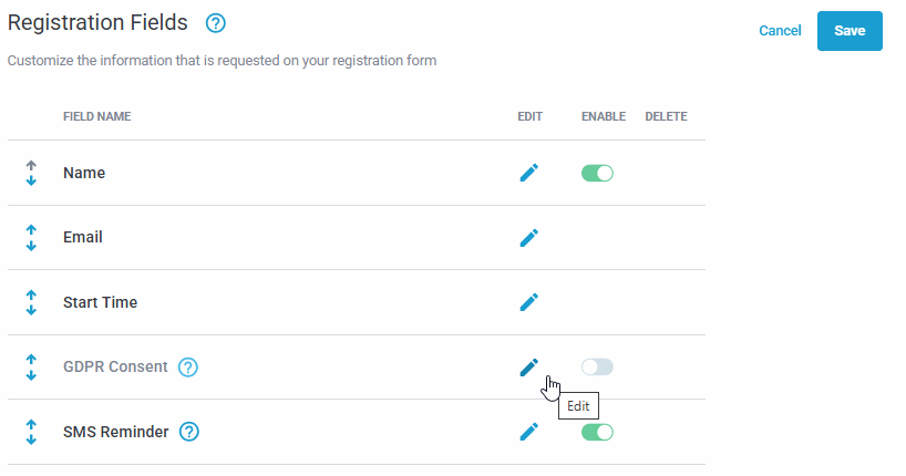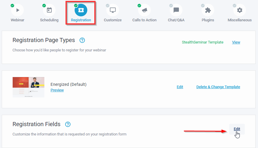 As shown below in Registration Section when editing any individual webinar event, Registration Fields > Edit