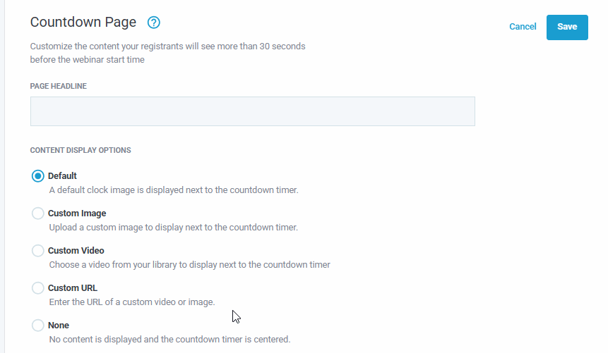 The Countdown page is similar to the Thank you for Registering page, it however is contained at a separate page that clients will land at from emailed link reminders. Clients will see this page when they arrive to your webinar link with more than 30 seconds until the webinar start time.