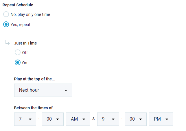 "Just In Time" is also known as "Webinar on top of hour". However, you are not limited to run webinar on top of hour only. "Just In Time" option is a repeating scheduler that has a range of options.