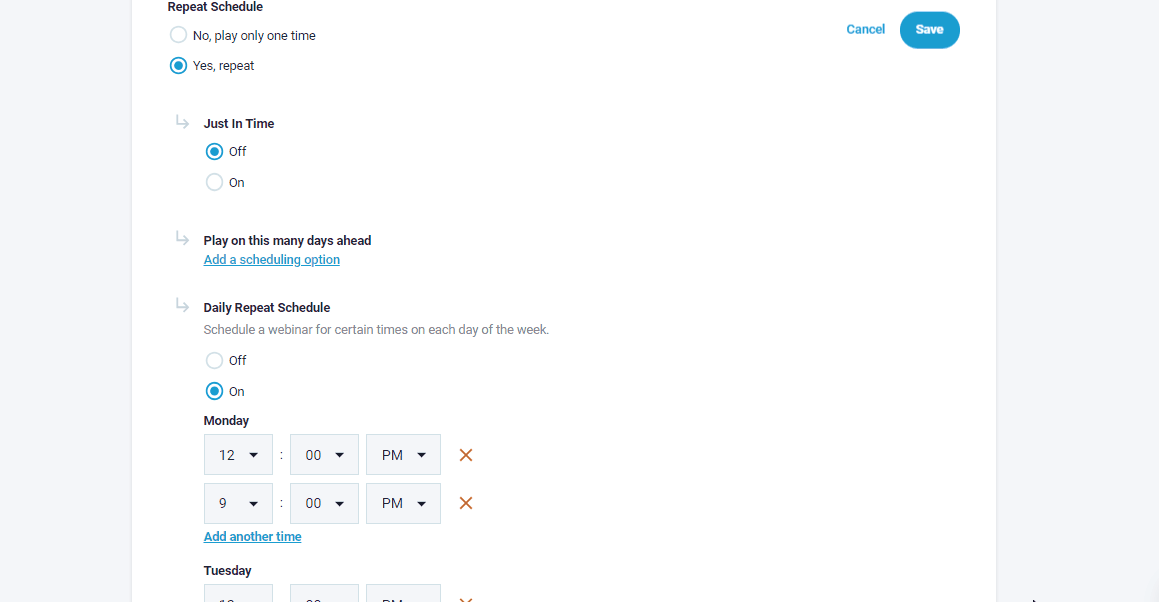 e.g. You want to run a webinar at 12pm and 9pm from Monday - Friday. On weekends, you want the webinar to run only at 5pm. This is how your schedule look like
