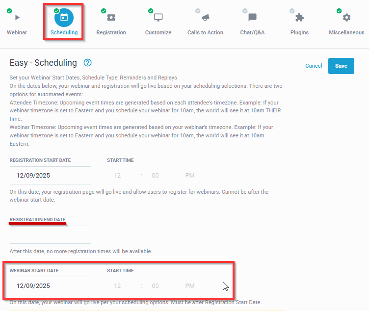 Once a client registers to the event, Webinar Start Date will no longer be available to edit.