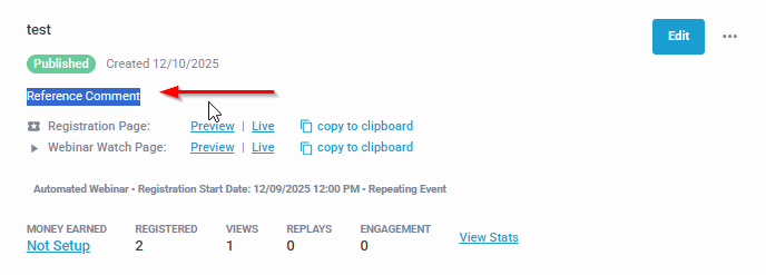 A reference comment is extremely useful item, when you setup multiple webinar events, or if you're using our registration embed widget at your 3rd party page. It can be any note or reference to a page, or marketing campaign you've setup to distinguish between events with same title or add a reference for yourself or your team.