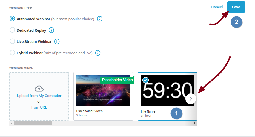7. Now just select your webinar video from this list, the latest webinar will be the first webinar in your list (note: Placeholder video first, then your uploaded videos), and hit Save