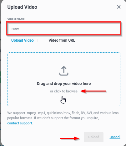 1. Go to My Library, click on Upload Video (We support .mpeg, .mp4, quicktime/mov, flash, DV, AVI, and various less popular formats)