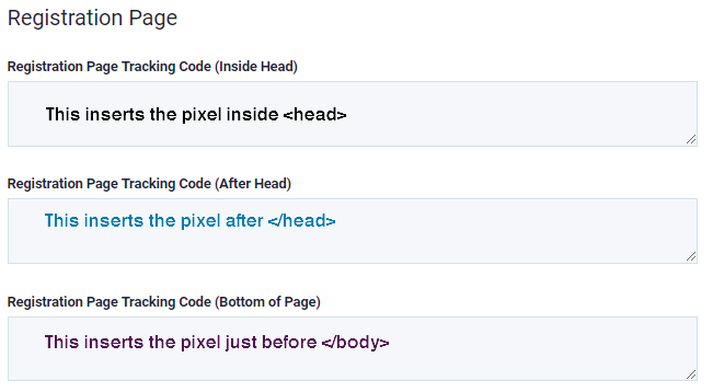 For example, if you are using a built in template, then for registration page, you should add the pixels here.