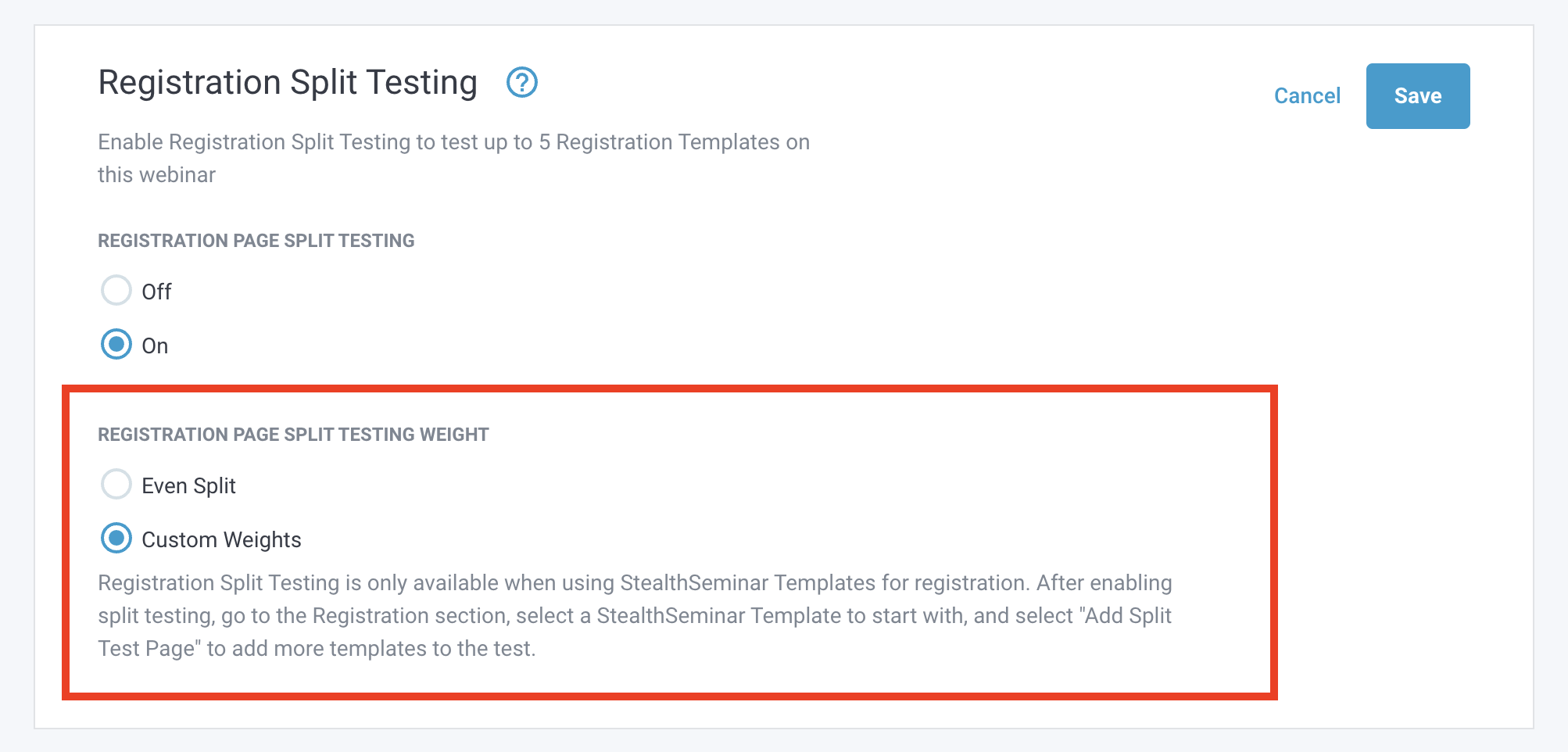 Registration Split Testing is only available when using Stealth Seminar Templates for registration. After enabling split testing, go to the Registration section, select a Stealth Seminar Template to start with, and select "Add Split Test Page" to add more templates to the test.