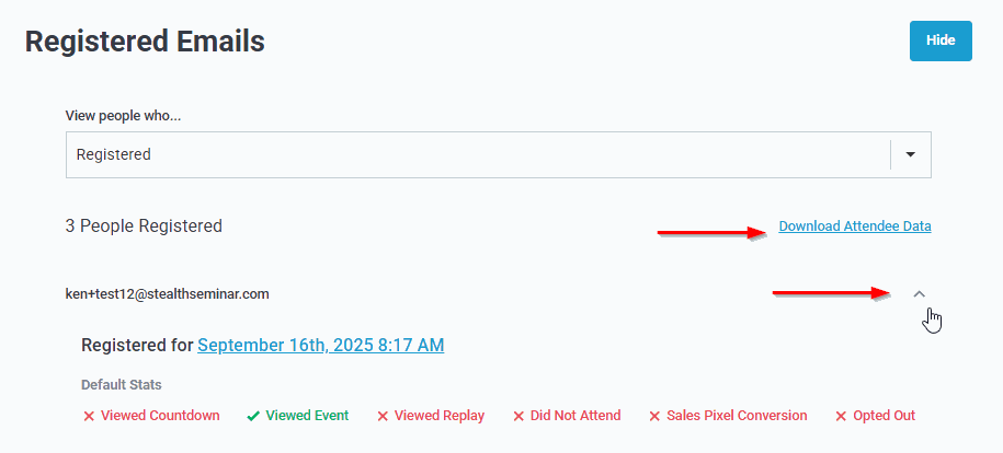 Quick tip: if you're looking for registant's details within your webinar event, scroll to the bottom of following stats. page & click SHOW,