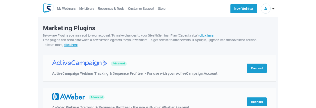 On this page, you will see all the available marketing plugins you can integrate with your StealthSeminar Account.