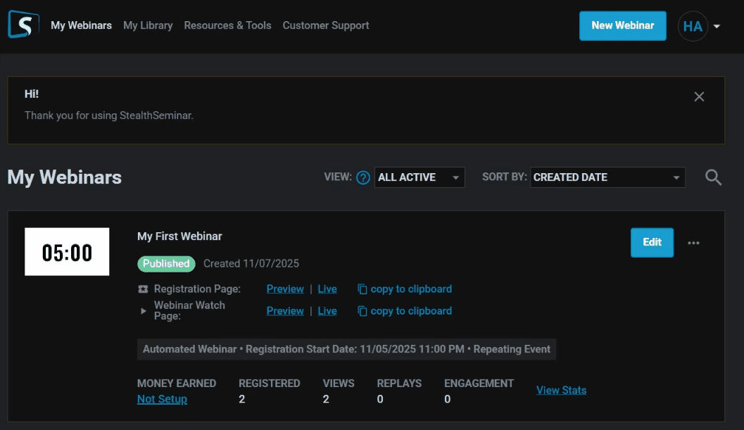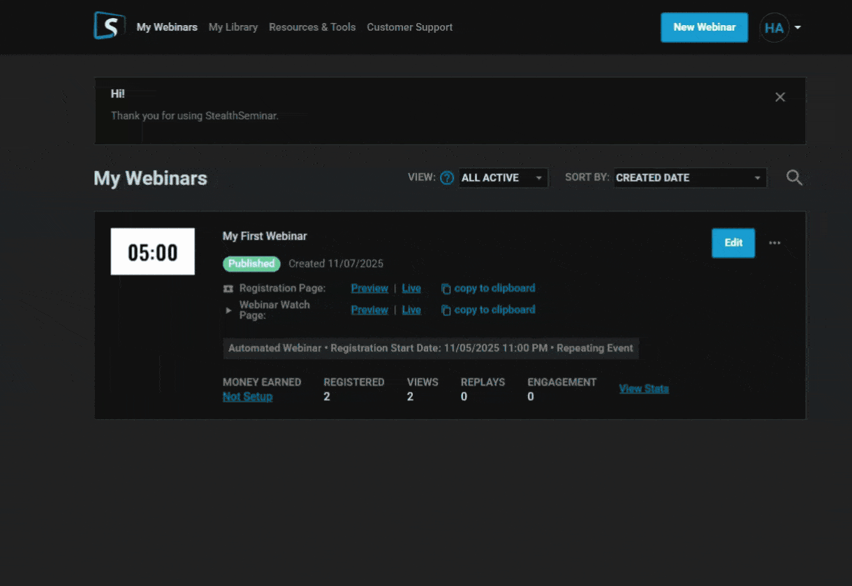 - Clicking on any webinar name will take you directly to that webinar’s splash screen settings page.