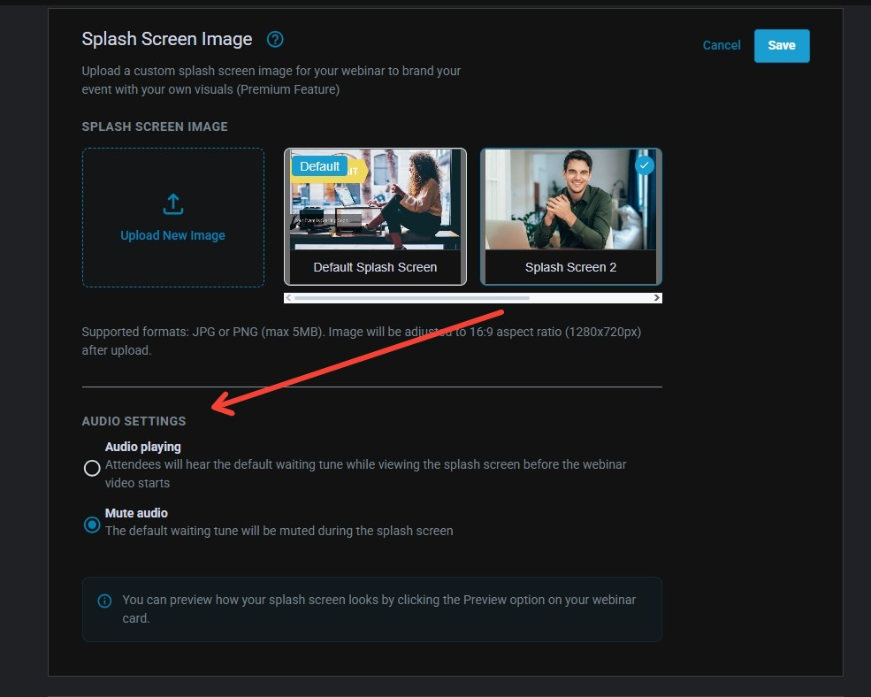 - You can upload a custom splash screen image and use it across multiple webinars.