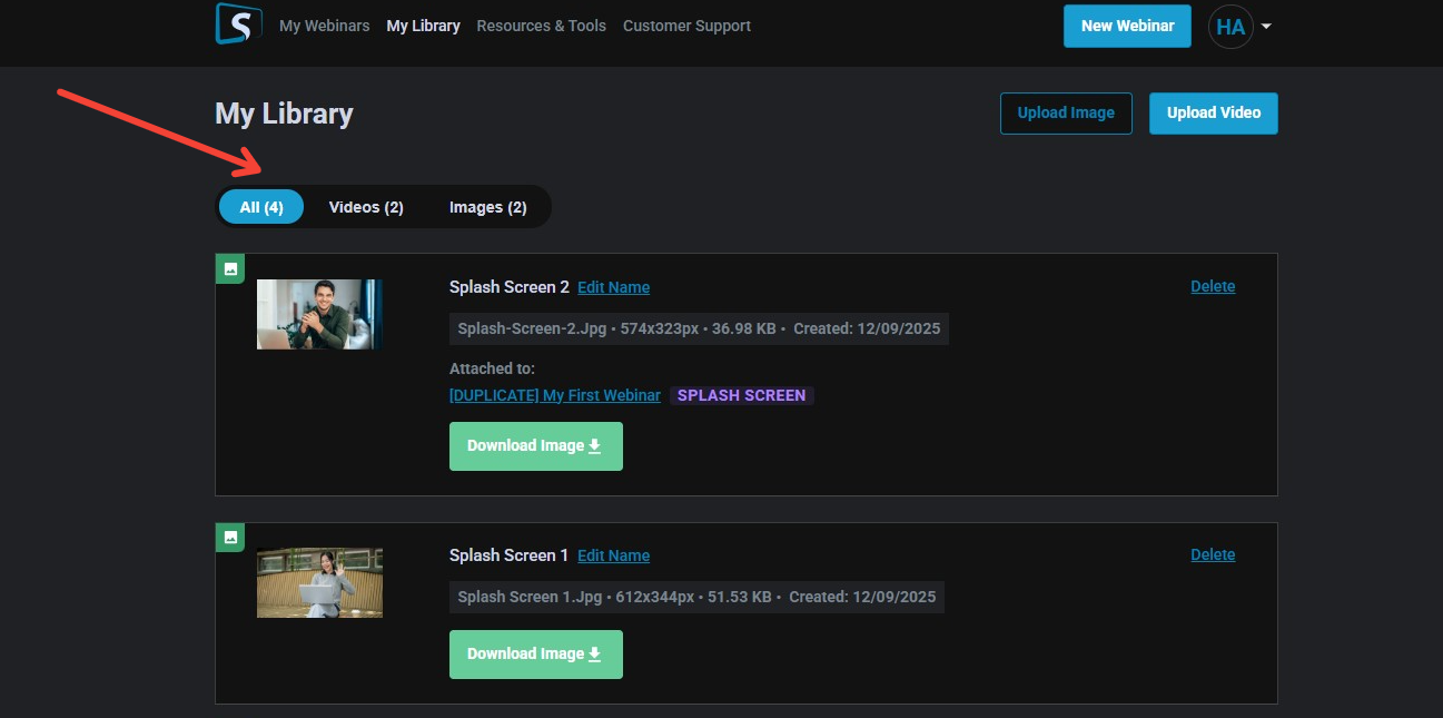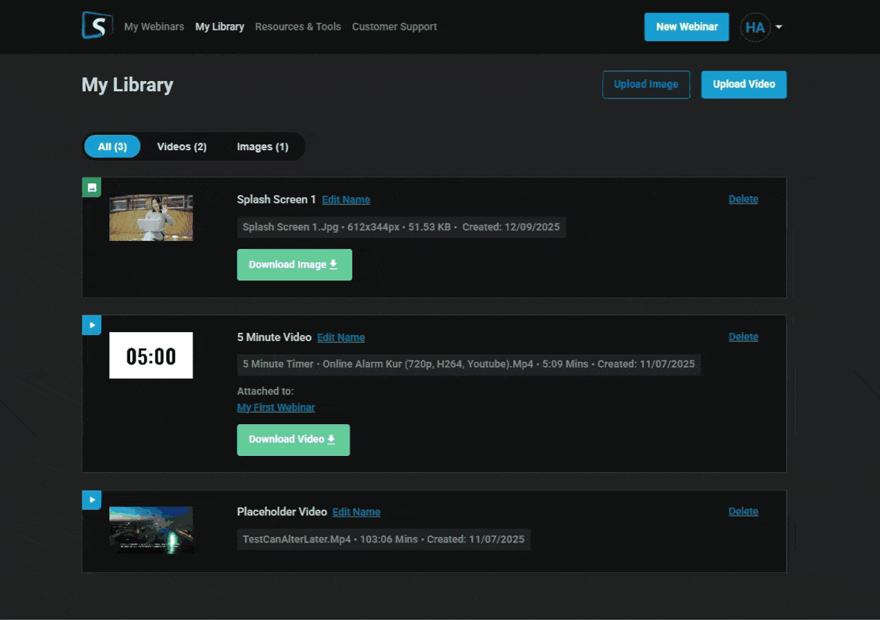 - For each image, you can view important details such as file size, resolution, upload date, and the list of webinars where the image is currently used as a splash screen. These webinars will appear under the Attached to section.