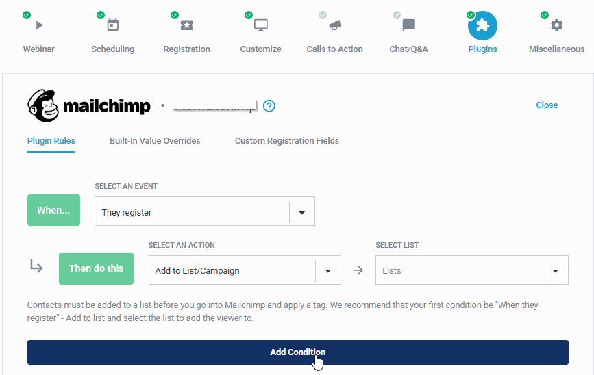That should complete the connection, once connected, setup the condition "when they register" as shown below.