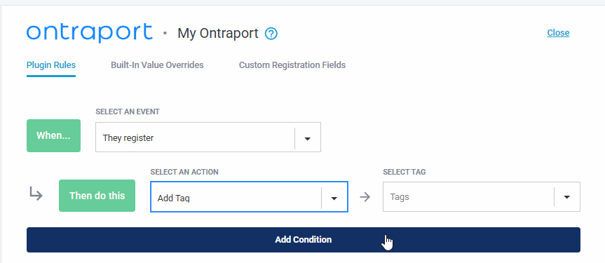 That should complete the connection, once connected, setup the condition "when they register" as shown below.